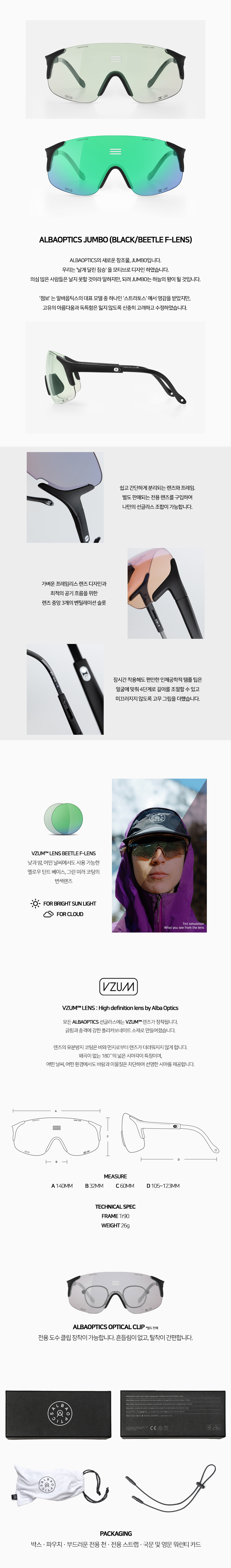 알바옵틱스 점보 블랙/비틀 미러 변색 모델입니다. 비틀 미러 변색 렌즈는 낮과 밤, 어떤 날씨에서도 사용 가능한 옐로우 틴트 베이스, 그린 미러 코팅의 변색렌즈입니다.