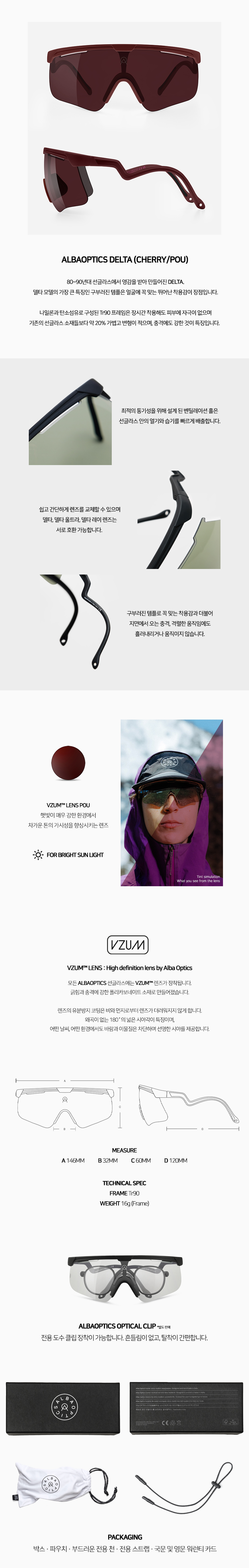 알바옵틱스 델타 체리/포우 모델입니다. 포우 렌즈는 햇빛이 강한 환경에서 차가운 톤의 가시성을 향상시키는 렌즈입니다.