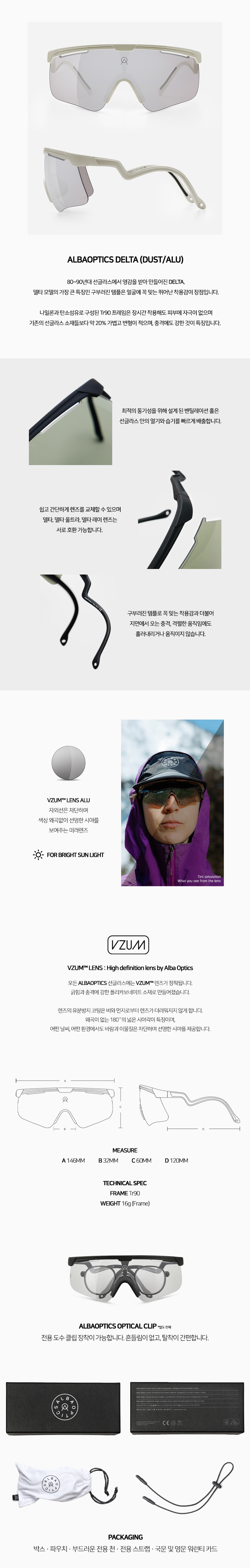 알바옵틱스 델타 더스트/알루 모델입니다. 알루 렌즈는 색상 왜곡 없이 선명한 시야를 보여주는 미러렌즈 입니다.