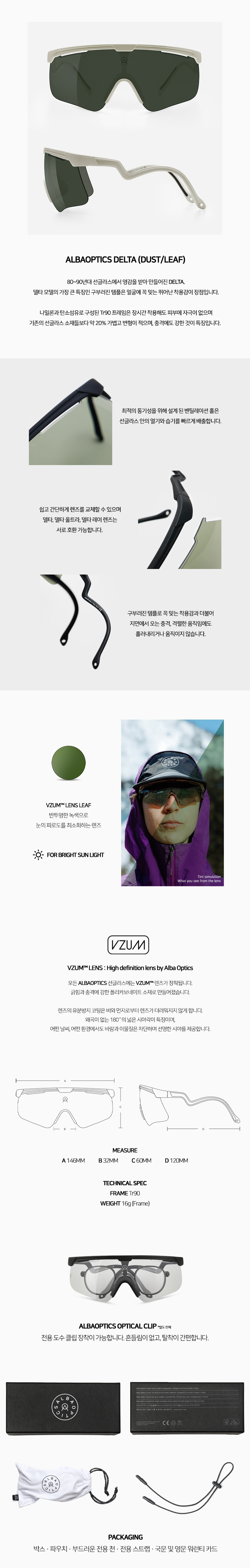 알바옵틱스 델타 더스트/리프 모델입니다. 리프 렌즈는 반투명한 녹색으로 눈의 피로도를 최소화하는 렌즈입니다.