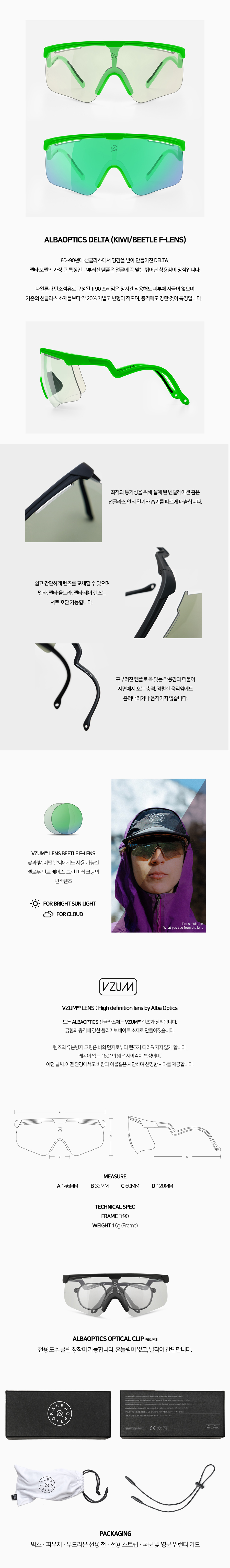 알바옵틱스 델타 키위/비틀 미러 변색 모델입니다. 비틀 미러 변색 렌즈는 낮과 밤, 어떤 날씨에서도 사용 가능한 옐로우 틴트 베이스, 그린 미러 코팅의 변색렌즈입니다.