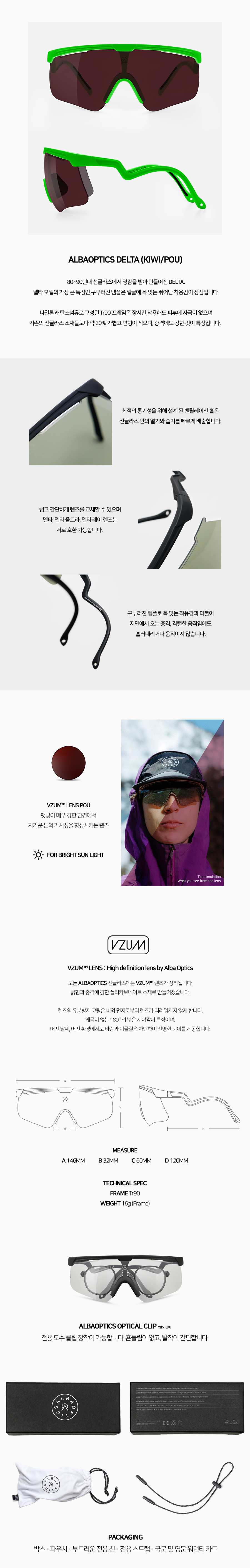 알바옵틱스 델타 키위/포우 모델입니다. 포우 렌즈는 햇빛이 강한 환경에서 차가운 톤의 가시성을 향상시키는 렌즈입니다.