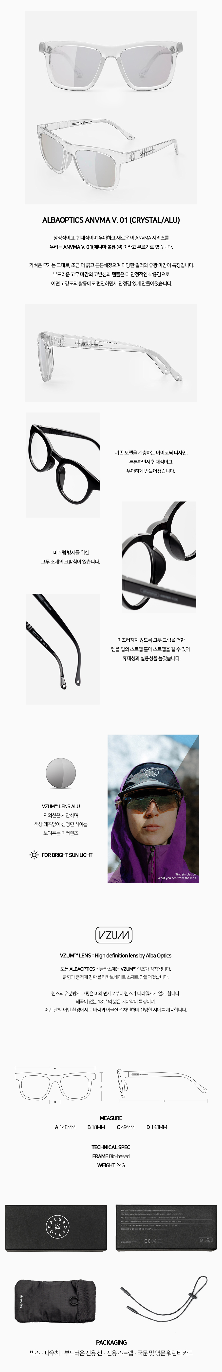 알바옵틱스 애니마 V. 01 (볼륨 원) 크리스탈 /알루 모델입니다. 알루 렌즈는 색상 왜곡 없이 선명한 시야를 보여주는 미러 렌즈 입니다.