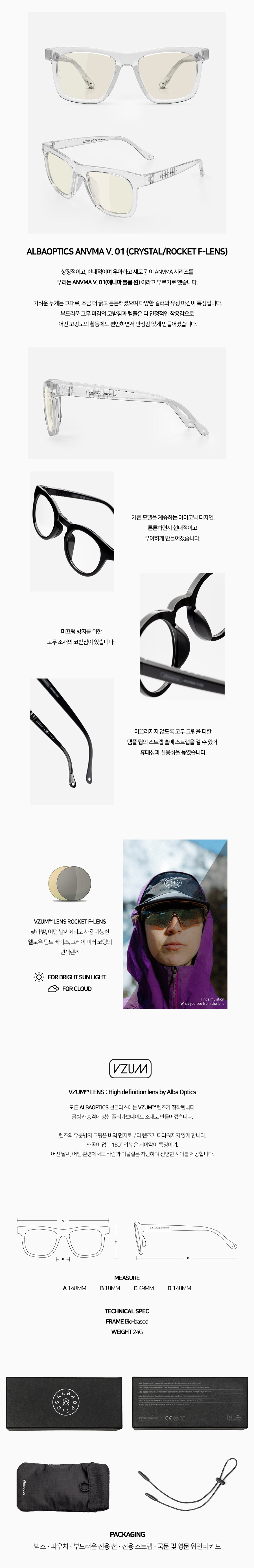 알바옵틱스 애니마 V. 01 (볼륨 원) 크리스탈 /로켓 미러 변색 모델입니다. 로켓 미러 변색 렌즈는 낮과 밤, 어떤 날씨에서도 사용 가능한 옐로우 틴트 베이스, 그레이 미러 코팅 렌즈입니다.