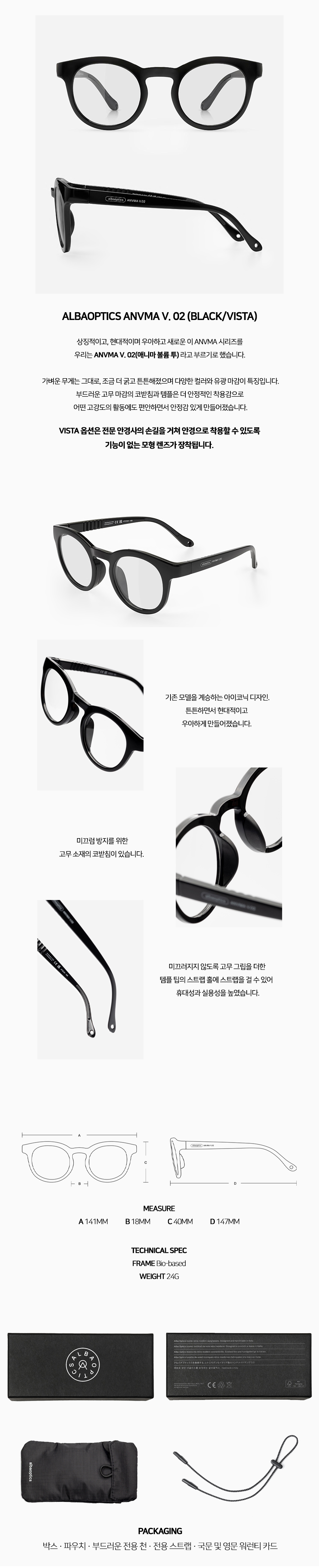 알바옵틱스 애니마 V. 02 (볼륨 투) 블랙/비스타 모델입니다. VISTA 옵션은 전문 안경사의 손길을 거쳐 안경으로 착용할 수 있도록 모형 렌즈가 장착됩니다.