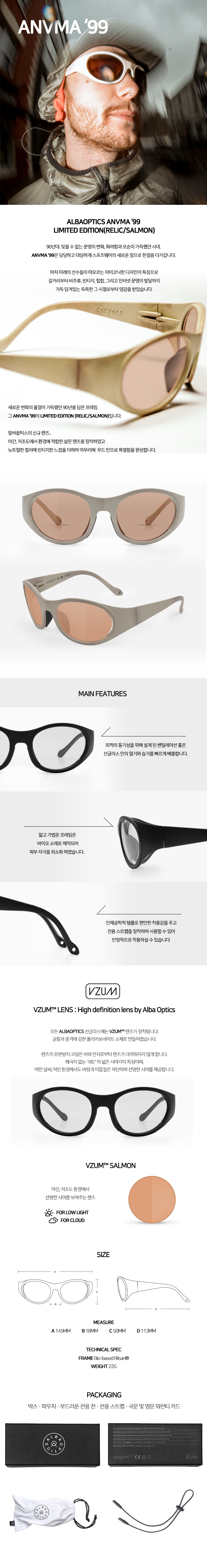 알바옵틱스 애니마 '99 리미티드 에디션 레릭/살몬 모델입니다.살몬 렌즈는 야간, 저조도 환경에서 선명한 시야를 보여주는 렌즈 입니다.