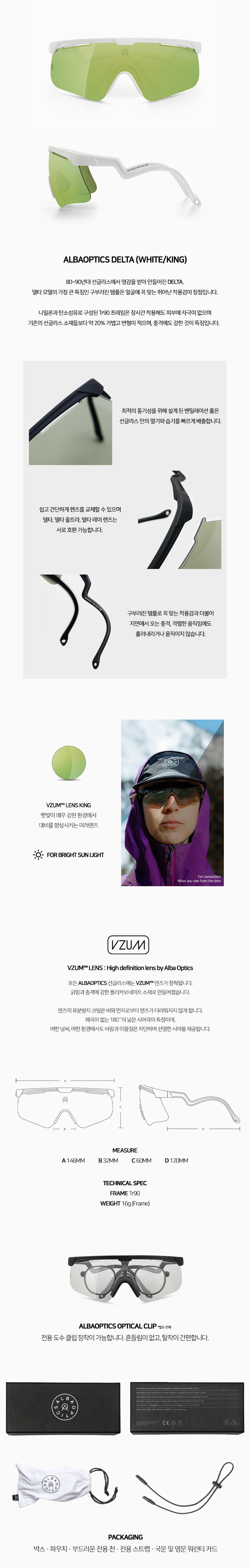 알바옵틱스 델타 화이트/킹 모델입니다. 킹 렌즈는 햇빛이 매우 강한 환경에서 차가운 톤의 대비를 향상 시키는 미러렌즈 입니다.